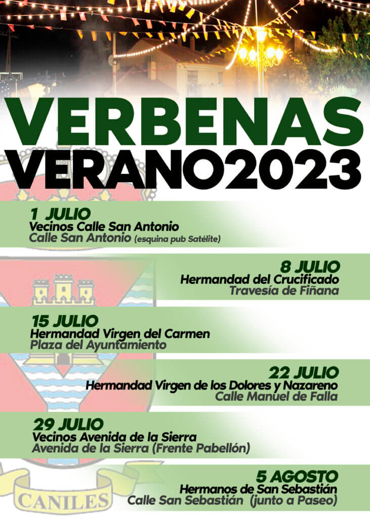 Todos los sábados del mes de julio (y el primero de Agosto) podremos disfrutar de nuestras verbenas en las calles de Caniles. Nuestros hermanos de San Sebastián, hermandades y colectivos vecinales se encuentran ya preparándolas para que todo esté a punto. ¡No te las puedes perder!